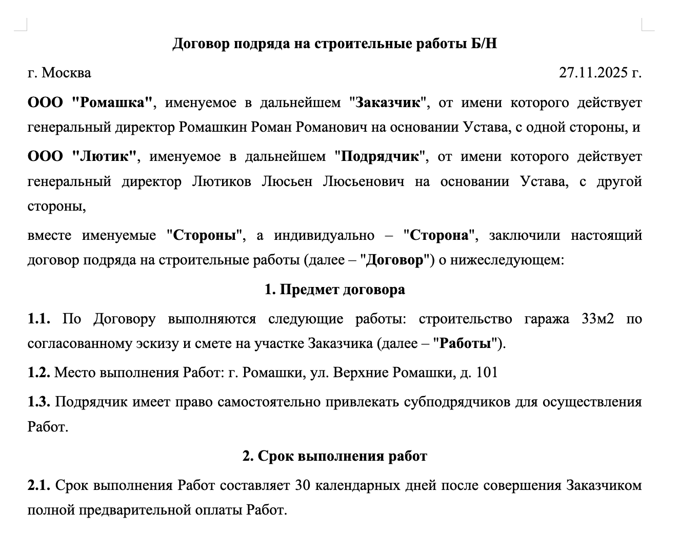 Вариативный шаблон расположен выше. Вы выбираете нужные условия, а система автоматически изменяет содержание договора у вас на глазах. Также при заполнении полей на сайте информация из них дублируется системой в другие поля договора (в случае необходимости), а при указании наименования сторон (для юр.лиц и ИП) автоматически заполняются остальные реквизиты.