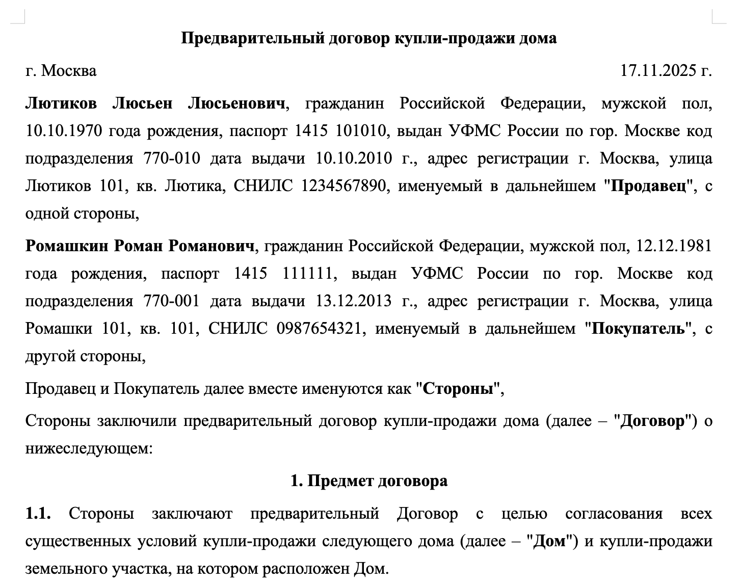 1.1. 1.1. Стороны заключают предварительный Договор с целью согласования всех существенных условий купли-продажи следующего дома (далее – "Дом") и купли-продажи земельного участка, на котором расположен Дом.