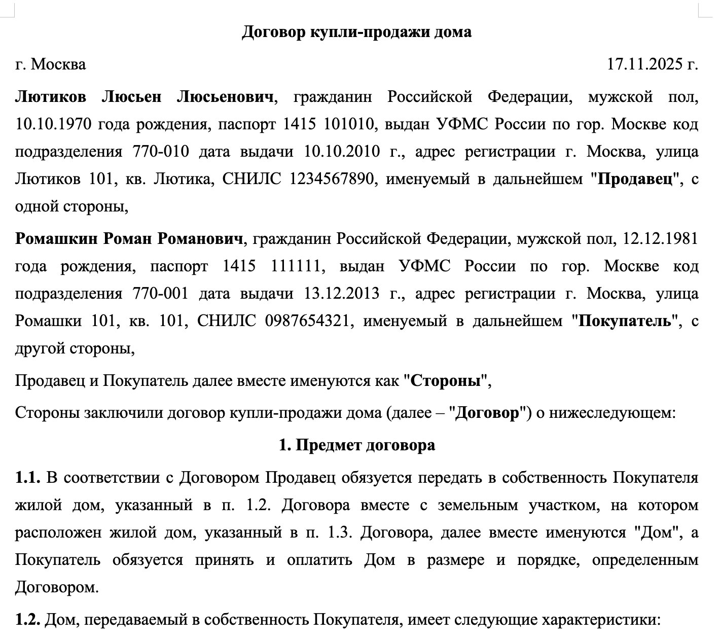 2.1. Продавец укажите ФИО продавцаname4 гарантирует, что на момент заключения Договора не состоит в браке и Дом не является совместно нажитым имуществом.