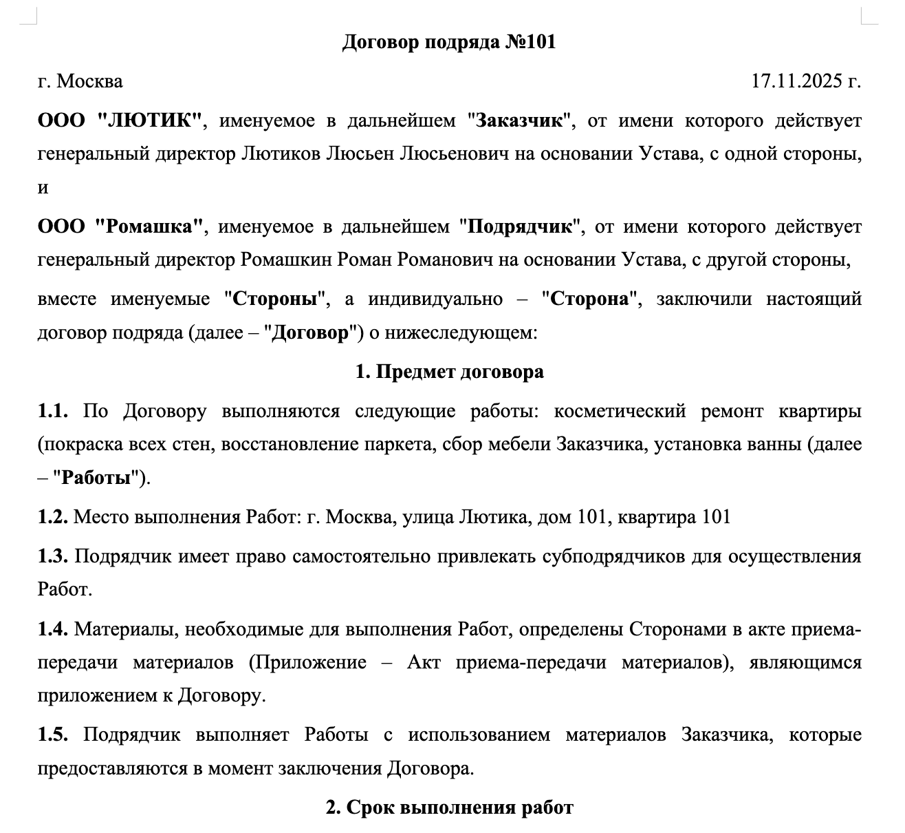 Вариативный шаблон расположен выше. Вы выбираете нужные условия, а система автоматически изменяет содержание договора у вас на глазах. Также при заполнении полей на сайте информация из них дублируется системой в другие поля договора (в случае необходимости), а при указании наименования сторон (для юр.лиц и ИП) автоматически заполняются остальные реквизиты.